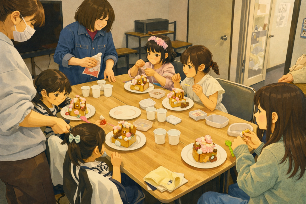 お菓子の家づくり(Gingerbread House Workshop) カラフルなキャンディーやアイシングを使って、みんな自分だけのお菓子の家を完成させました!