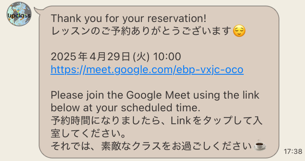 このメッセージには、レッスン当日に使用するGoogle Meetのリンクが含まれています。
